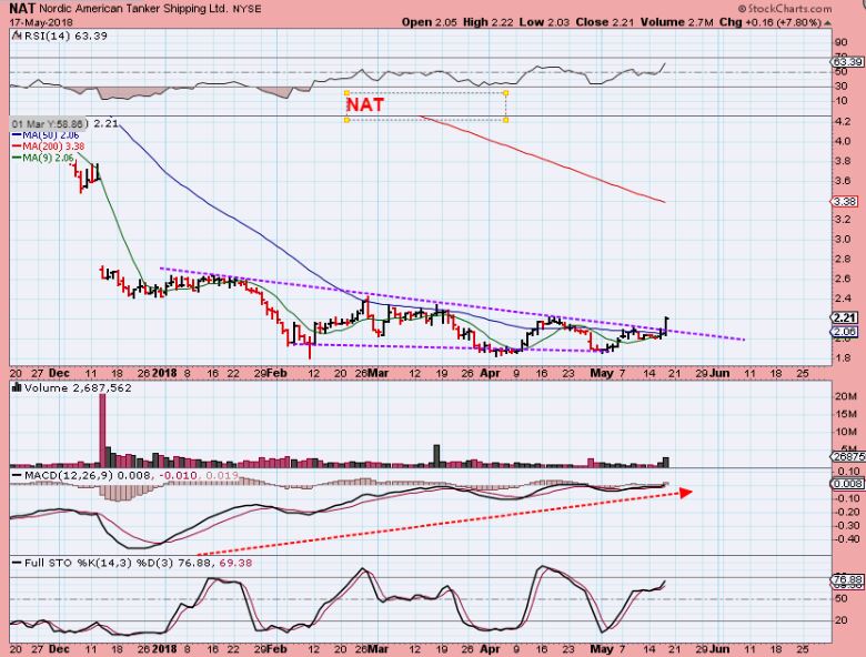 NAT – A shipping stock, NAT broke the down trend Thursday. It could be bought with a stop under Thursdays lows or that trend line. As a Trader – I put a bid in for $2.21 in after hrs when I saw this and the order filled, so I own it right here. I’m hoping for immediate follow through.