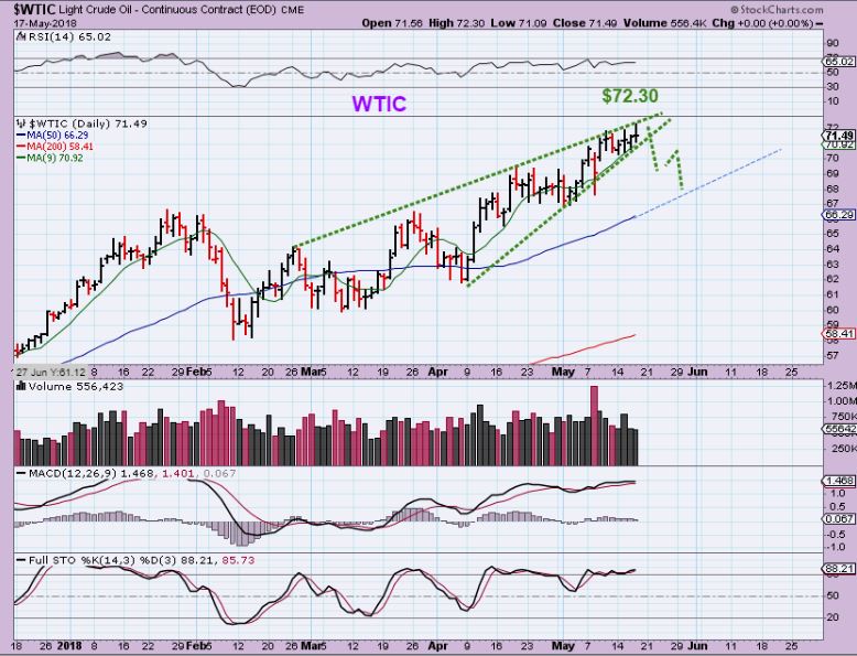 WTIC – Oil did hit $72 and that rising wedge has price right at the Apex. I personally expect a dip to a dcl, and then ANOTHER run to new highs, and $74 has been a 2nd target of mine.
