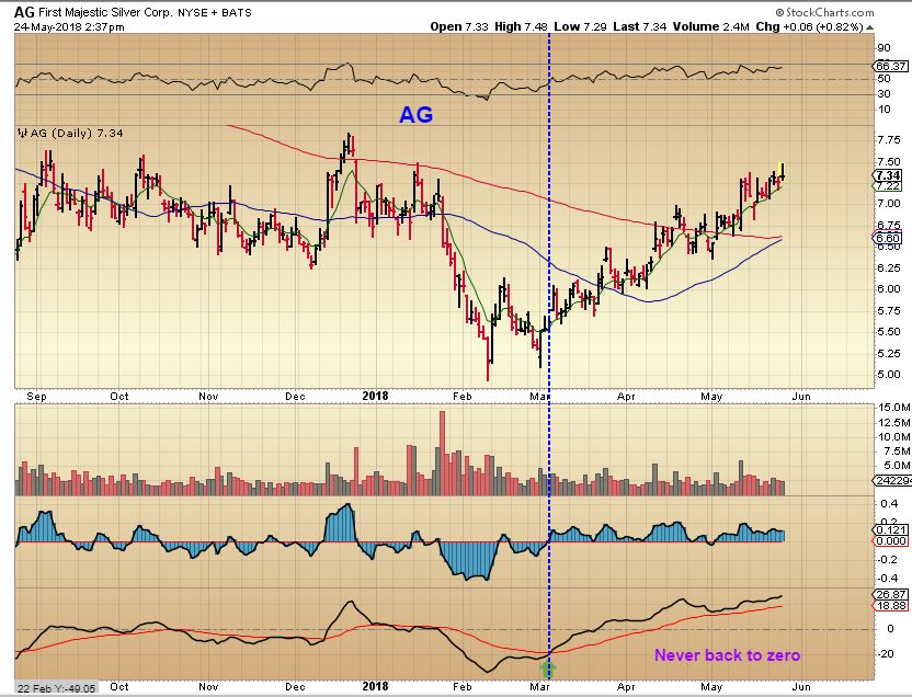 AG – That possible ICL in Feb for Miners shows up on the chart for AG too. It became a buy on the drop in March with strong divergence in the lower & Middle indicator. It has never dropped back below that zero line either. It has not dropped below the 50sma, and now it is above the 200sma. I did recommend AG a few times, but DID YOU MISS THE BIG MOVE IN AG? Not really…