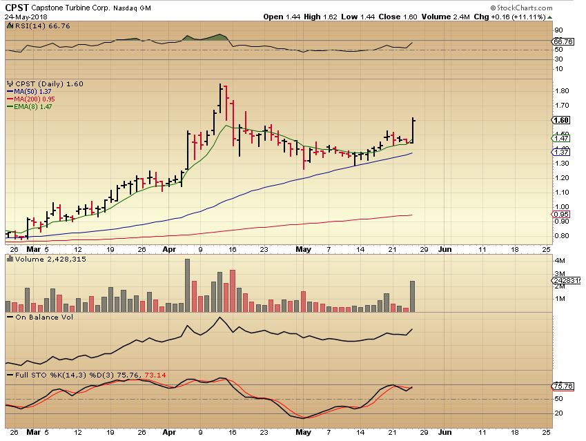CPST – This looks bullish off of that 50sma and looks ready to continue higher. It may stall, it may do a bull flag, or it may just keep going, but the high volume pop looks quite bullish.