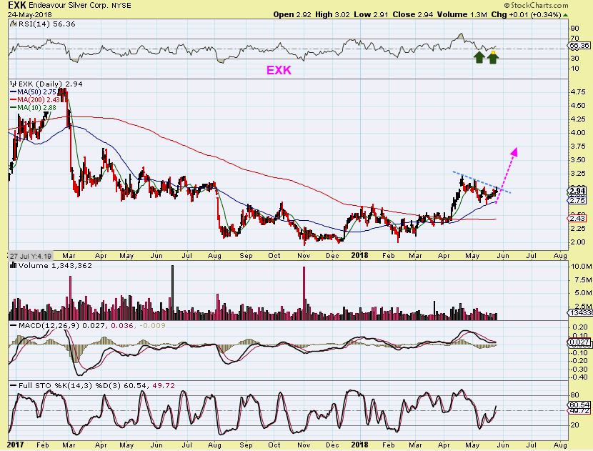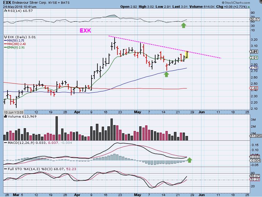 EXK – I would buy this here, but with the understanding that it could drop to the 50sma one more time if GOLD did a shake out type move into an ICL. Maybe waiting for a break out over the down trend line is safer. You need a stop just in case the base metals sell off, but this looks ready to break out. I would Start small & add on a break out?