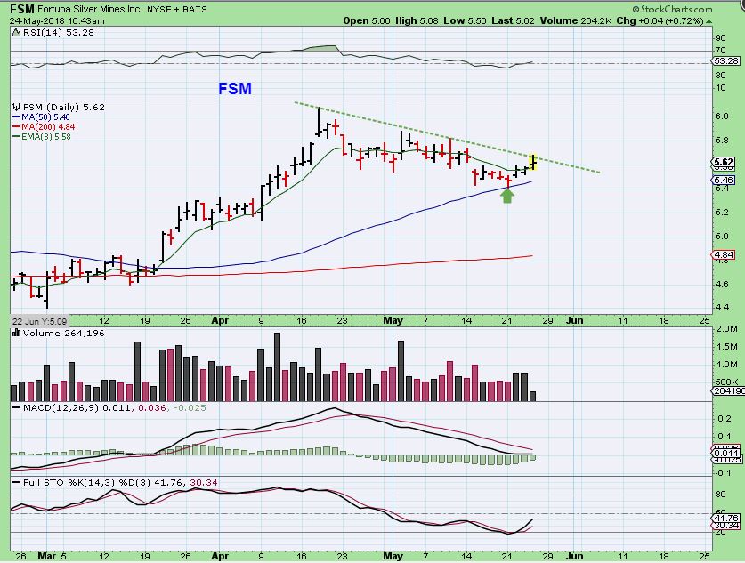 FSM – This is a similar set up to EXK. If it was a tech stock I would say to buy it with a stop under the 50sma, and add on a break out above the trend line.