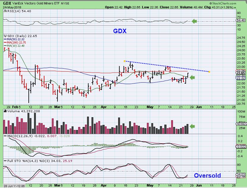 GDX – Volume by the end of the day did increase. GDX broke to new lows on Wednesday and then moved above the 10sma Thursday. It also recovered the 50sma. At this point, I want to be clear that this doesn’t look that much different from the rise starting on May 1st. That rise didn’t burst higher, and this one may not either, but I took a trade and can use a stop. We’ll see if it can break above the 200sma for starters.