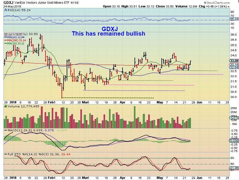 GDXJ #1 – Honestly, GDXJ just looks bullish, like it is marching along and ignoring Gold. GOLDS $20 drop below the 200sma last week DID NOT Cause GDXJ to break down. It gapped down, but not to new lows. GDXJ remained Bullish. We had to be cautious with a Gold ICL approaching at that time, but look at GDXJ making higher lows as GOLD dropped below the 200sma. Also…