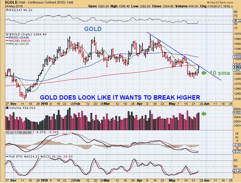 So we are looking for signs of bullishness, and GOLD and the Miners do look to be set up bullishly. Gold moved above the 10sma and so did GDX & GDXJ, so they actually look to have swing lows in place. I TOOK A SMALL POSITION AND WILL ADD IF GOLD BREAKS ABOVE THAT DOWN TREND LINE. Some may wish to wait for that break out first.