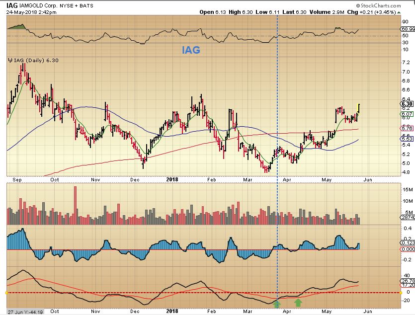 IAG – IAG also became a buy in March and never dropped below the zero line on the lower indicator. IAG then broke out & held the 50sma on a back test. It ignored GOLDs recent $20 plunge last week.