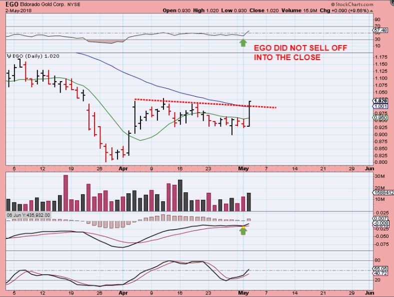 EGO – EGO was up almost 10% and DID NOT sell off into the close when Gold did. It broke the 50sma and closed above it as GOLD sold off. I would say that EGO is a tad riskier, but it is a buy here at the lows.