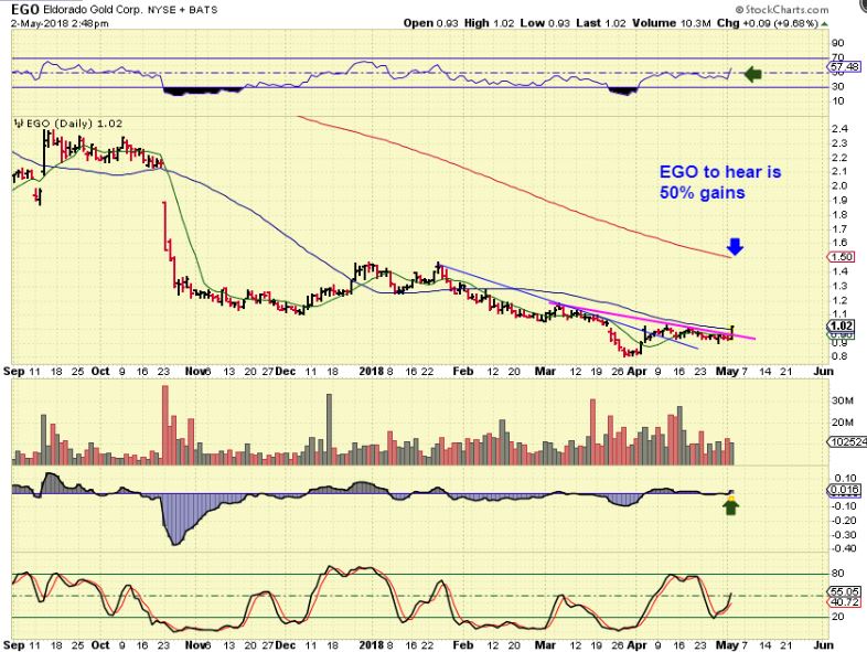 EGO – Beaten down – this is likely due to a situation they are experiencing in Greece with one of their mines. This may look ugly, but it really looks like a good chance for some upside potential. If we see GOLD break out and run to $1500 to $1700 in 2018, EGO will not remain down at these lows. It will probably be up hundreds of % points. In fact…