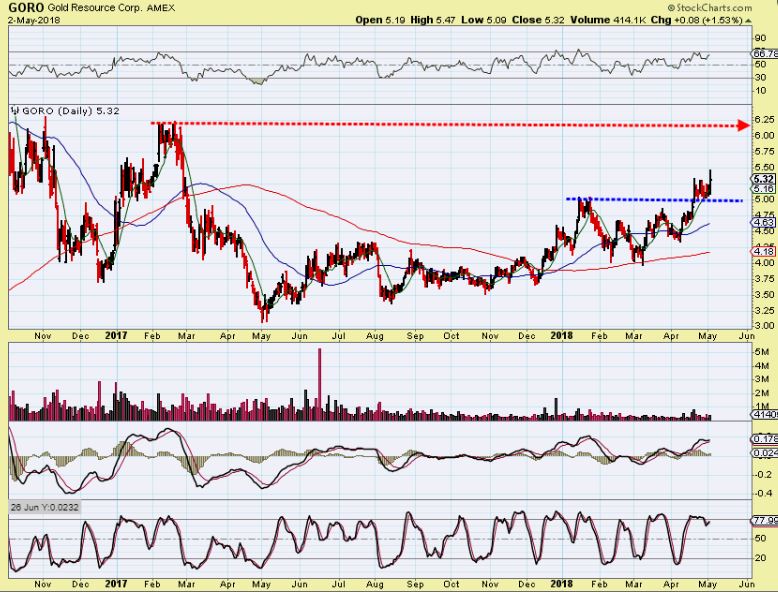 GORO – GORO bottomed in 2016, and has now also bottomed in a long consolidation in 2017. It has doubled since that 2017 low. It is NOT an easy ride, but it is a bullish chart in the bigger picture. It recently broke out in April after tagging the 200sma, & back tested that break out