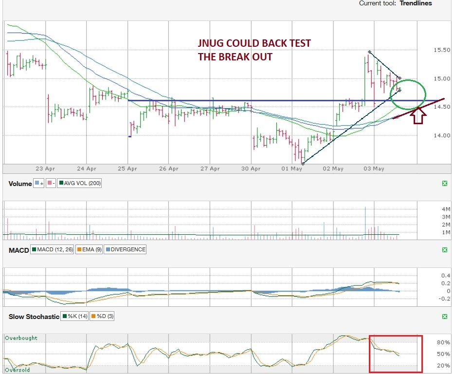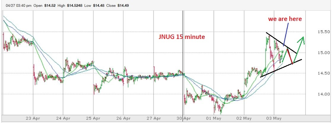 So this is what I see on JNUG – Still well off the lows , possible triangle forming to relieve overbought on a 15 minute charts