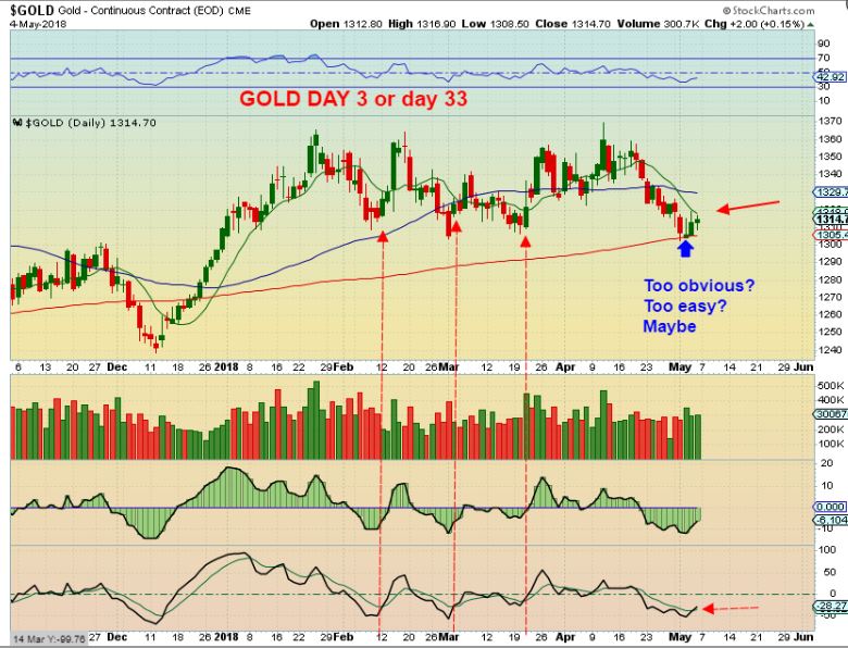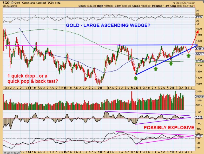 2. GOLD FROM APRIL 20th report – This is a bullish set up and in my opinion, it does NOT call for a very steep drop to set up the bullish break out. So I drew a drop to about $1300 here, and we dropped to $1302 this week. The lower indicators are building steam in my opinion.