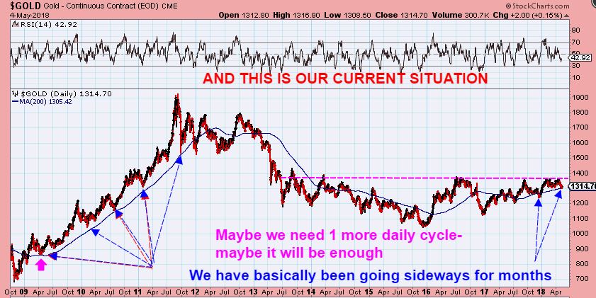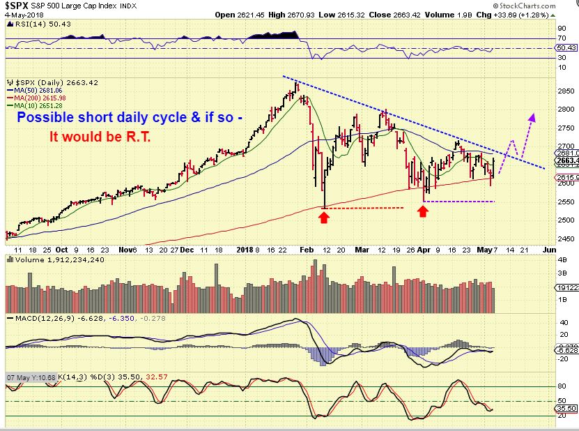 SPX CURRENTLY– We got a strong reversal Friday in the General Markets, and we have our higher lows in tact due to the triangle shape. The 200sma is acting as support so far, and this could break out higher, which usually starts a new daily cycle ( When a triangle breaks, I often just start a new count, just like I did with Miners in Feb).
