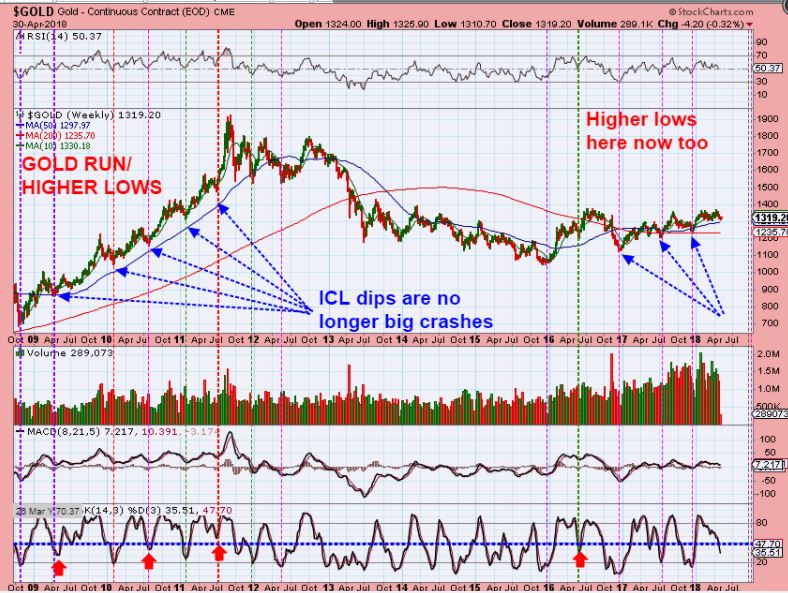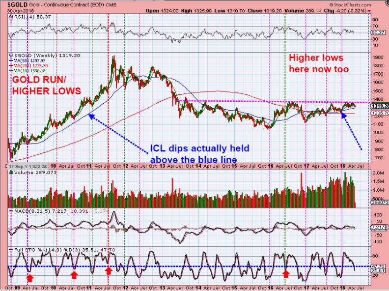 3. GOLD – Look at Gold During Golds prior Bull Market Runs on the left side of this chart. After the 2008 Lows, the ICL dips did not really bust down below the 50 weekly ma, right? No, during that bull move they didn’t crash very much. See the Blue Arrows. So recently Gold HAS been making higher lows as ICLs now too, right? That’s a bull move. DO you see what I am eluding too?