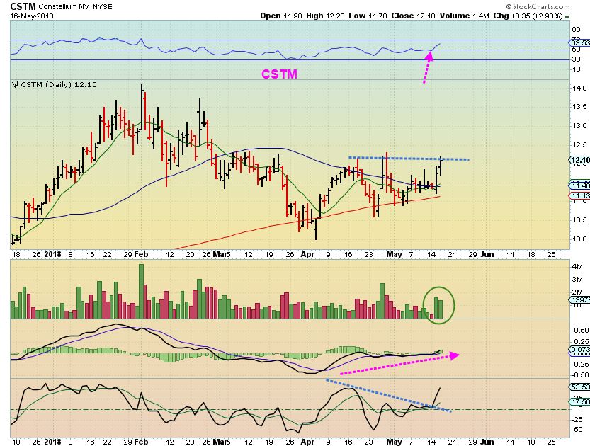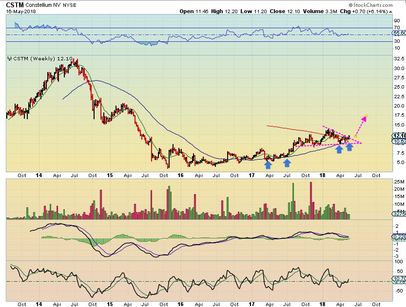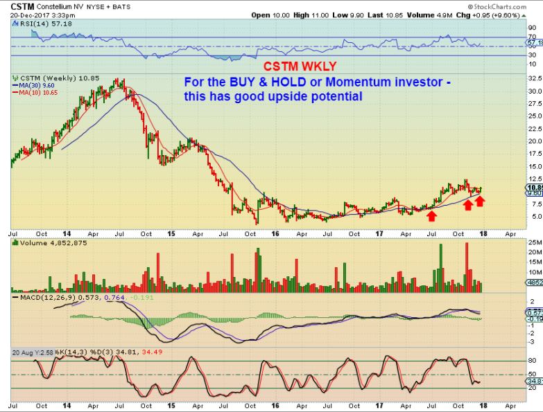 CSTM #1 – Last DECEMBER, I pointed out that I really like the Big Picture Chart of CSTM as it ran from $5 to $12.50 & pulled back to $10. It was in a consolidation phase, but looked ready to go again. It then ran to $14 and is now at $11 ish again. I believe that it is a good long term buy & hold, let’s zoom in.