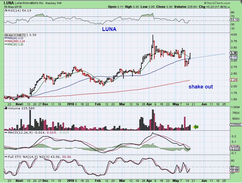 LUNA – Just a reminder, LUNA looks to be recovering as a low risk buy here. MAY 2 was earnings release, and that gave it no reaction. I don’t know why it dropped on May 11, but it has recovered.