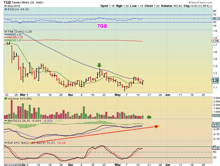 TGB – Talk about FRUSTRATING! I have been pointing out TGB for a couple of days. I decided to buy it ahead of a break out above the 50sma yesterday. I put in a limit order at $1.17 and had to leave for the day. When I came home, TGB had surged higher in the final hour, and it only filled a small partial of my order 🙁 I own 1000 shares of TGB, but want more. This looks ready to break out higher, doesn’t it?