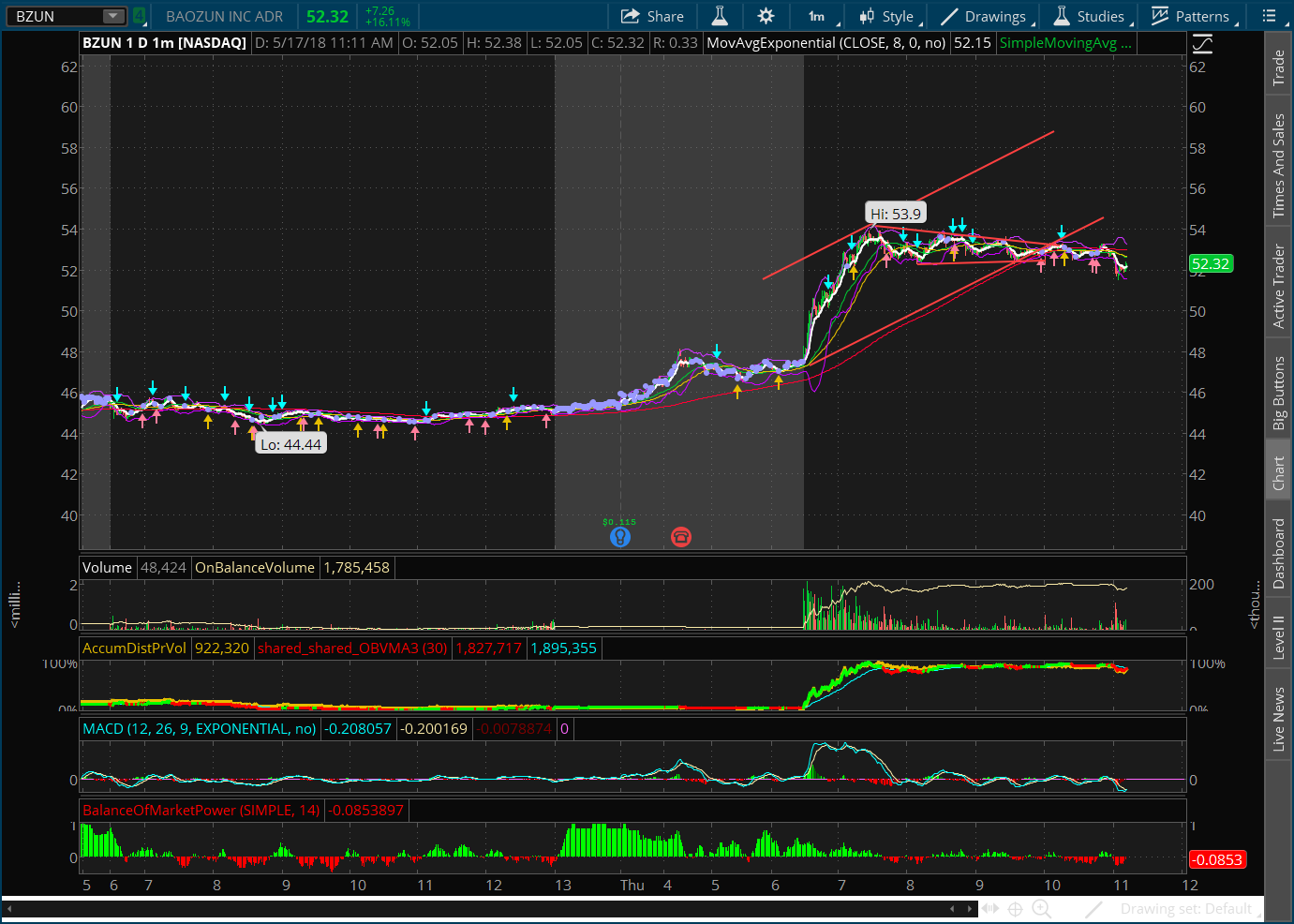 BZUN in 2 hour lower vol bull coil .. nice run on strong ER… IF pops coil thru 53.90 ATH with vol targets 55/56