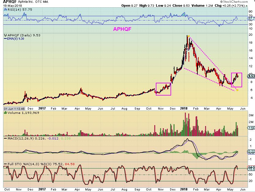 APHQF MAY 18th – This broke from a wedge and is also above the 50sma. Here I was just pointing out ( Boxes) that the recent run higher is similar to the start of the November run higher.