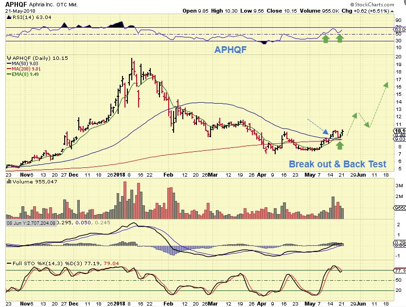 APHQF – A close up shows that APHQF broke above the 50sma a week ago, and back tested it. THAT IS A BUY IF IT REVERSES THERE AS SUPPORT, and it did.