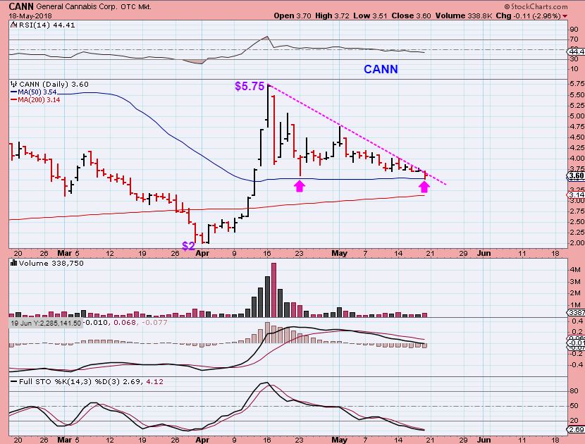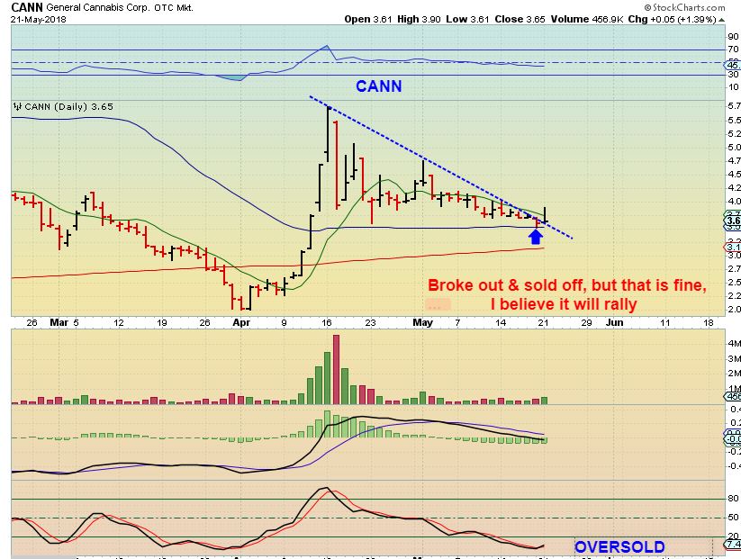 CANN FROM MAY 18 – Bouncing off of the 50sma and at the downtrend line, it looks ready to go soon. Will it POP? …