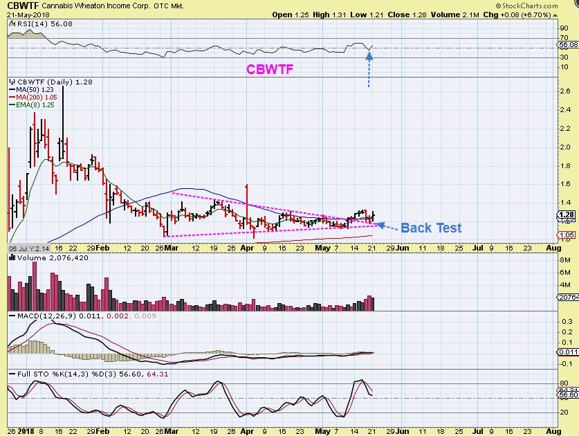 CBWTF – It broke above a wedge and the 50sma, and has now done a back test and reversal. This is sort of a ‘streaming’ company and I expect it to do well over time.