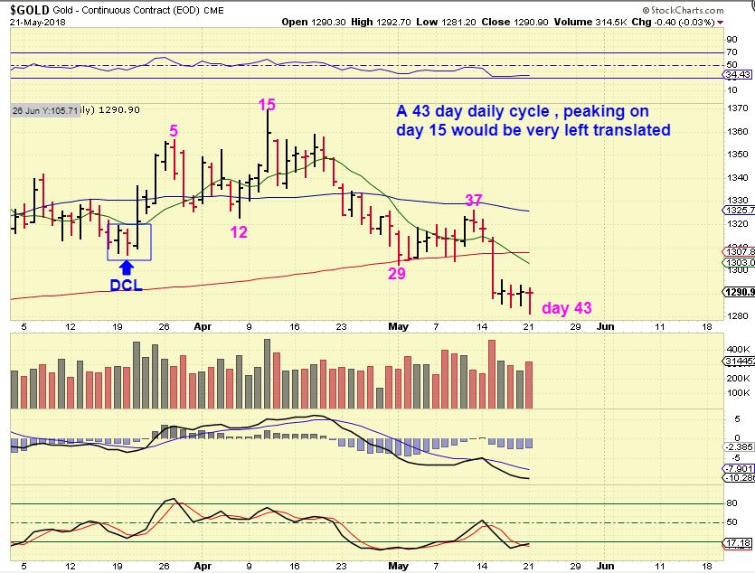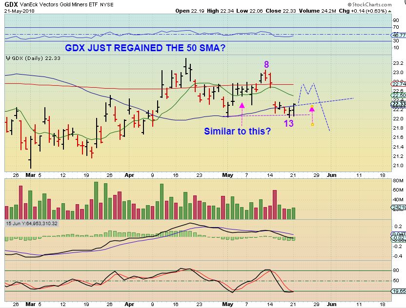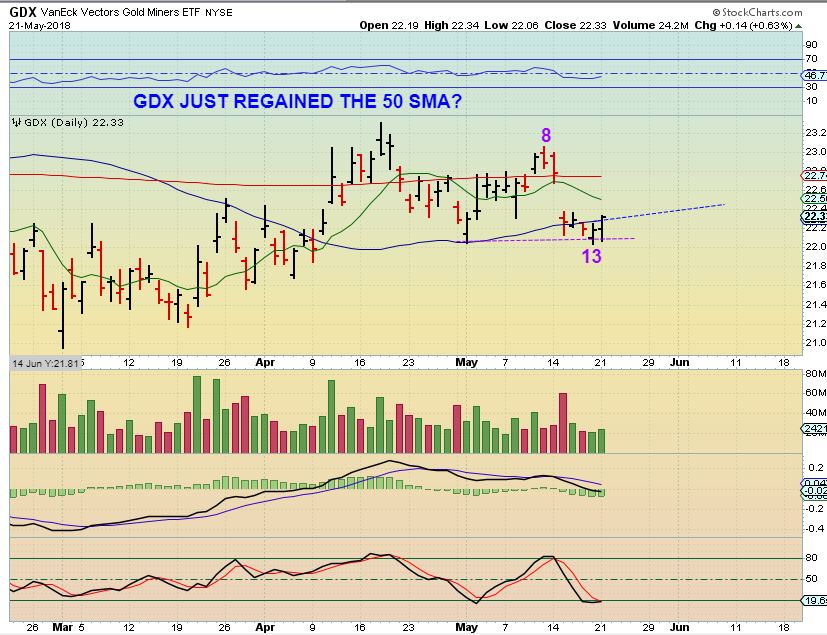 GDX #1 – NOTICE THIS – GDX pushed higher with Golds sell off Monday and closed at the highs of the day, above the 50sma. A reversal re-gaining the 50sma should draw in traders. Day 13 DID break the May 1st lows, unlike SIlver which is making higher lows. That break of the may 1st lows should make this a failed daily cycle, but that is a more bullish looking chart than Gold, since Gold is at new lows. This will either suck in the bulls for a quick ICL drop & Slaughter, or something odd is playing out.