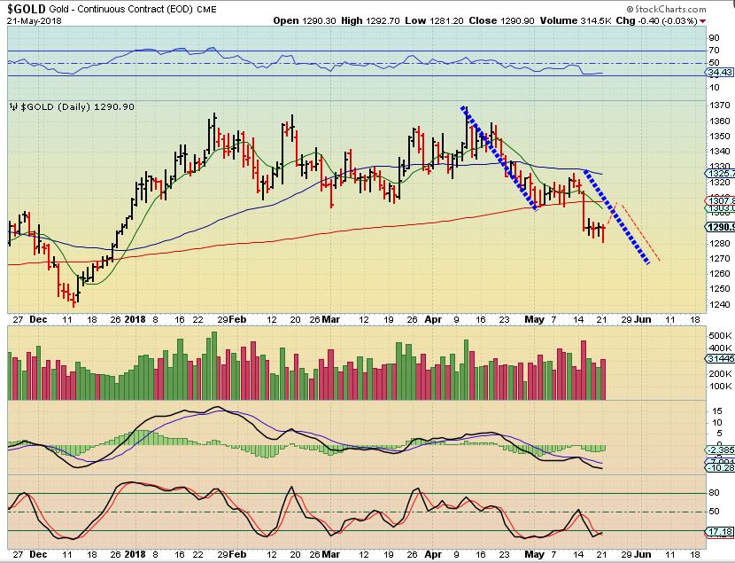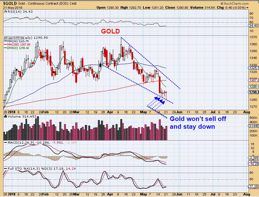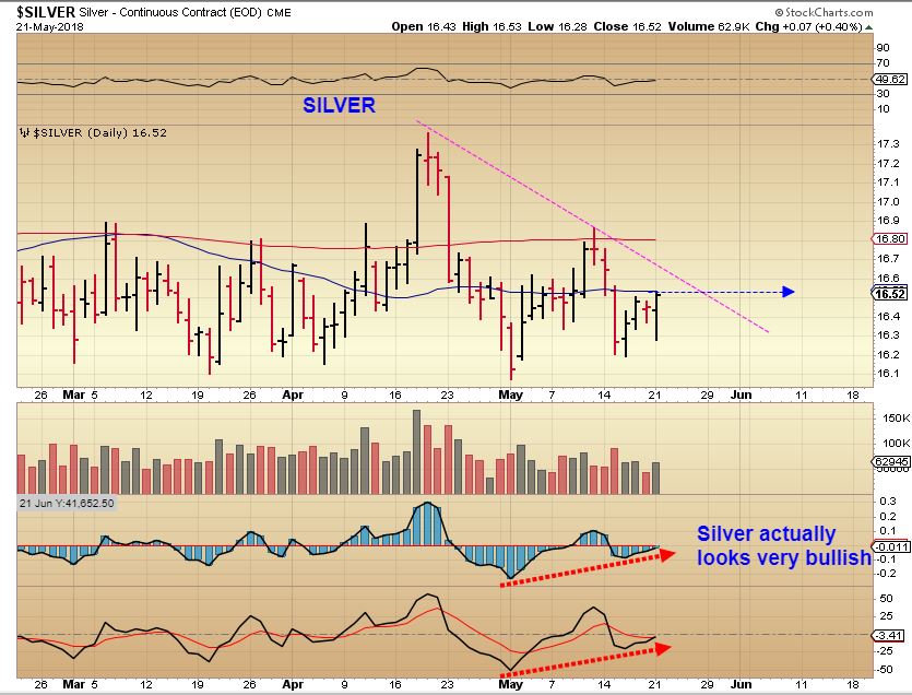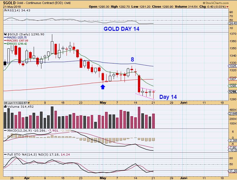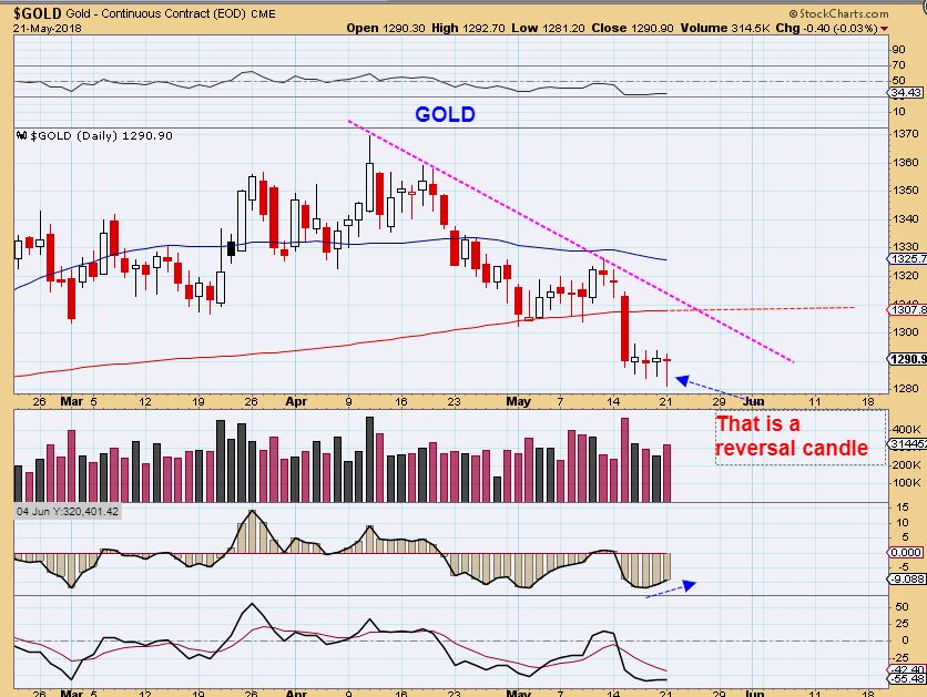 SILVER – Silver is making higher lows and did a reversal to the 50sma Monday. It has BULLISH indicators. Silver looks like a MAY 1st dcl, with a bullish divergence& higher lows, so this doesn’t exactly Match Gold- Gold is at lows.