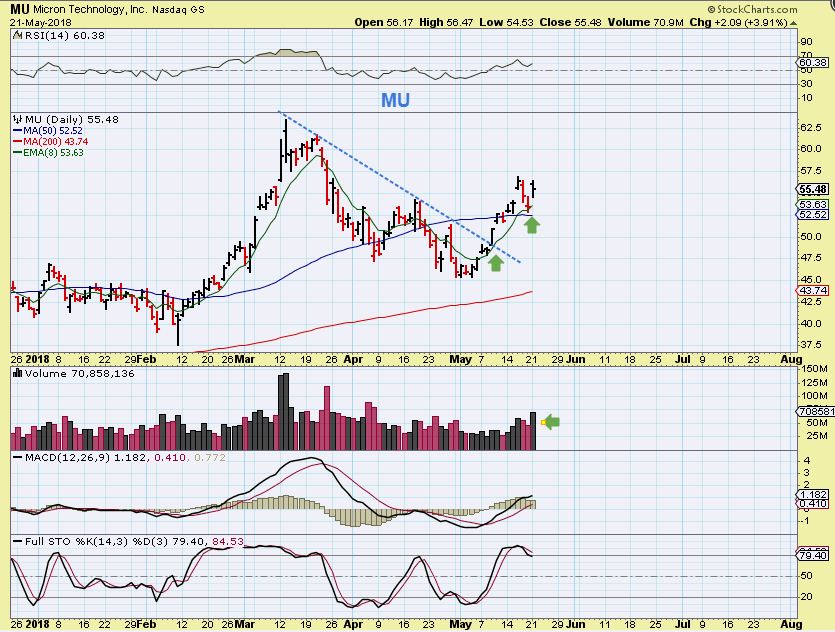 MU – After a solid 10 day run higher, MU finally pulled back to test the 50sma & trend line break last week, so I posted this chart as another opportunity to enter on support. This makes for a low risk buy, with a tighter stop possible.