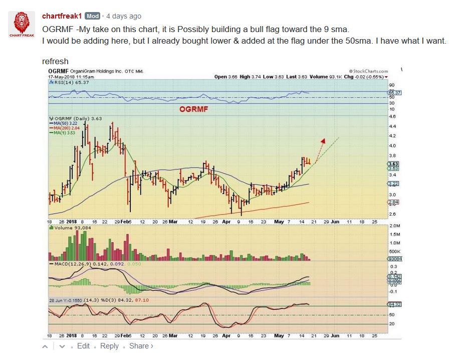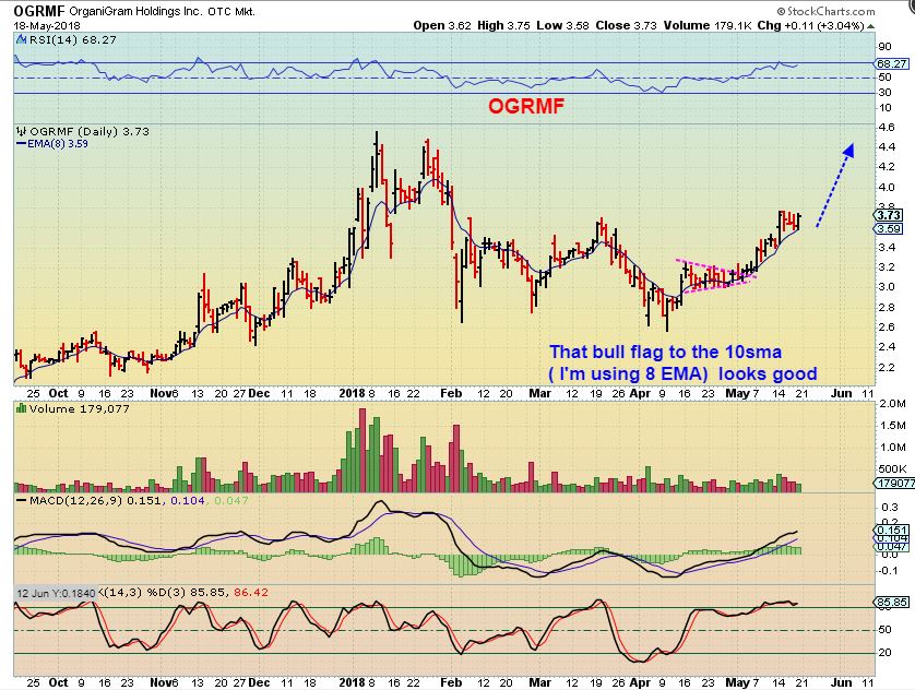 OGRMF CHART 2 of 4 FROM LAST WEEKS REPORT – After OGRMF broke above the 50sma it has been slowly but consistently running higher, I posted this Bull flag possibility last week as a buy at the 9 sma.