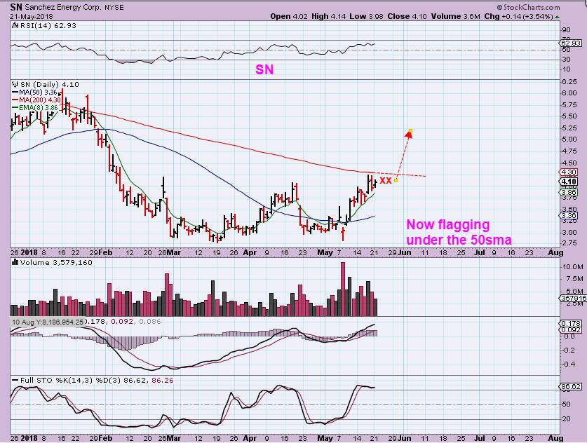 SN – SN was pointed out as a bit of a lagger breaking above the 50sma in early May. Now it is pushing on the 50sma. One could Buy the flag or wait for a break out, so this could go on a watch list.