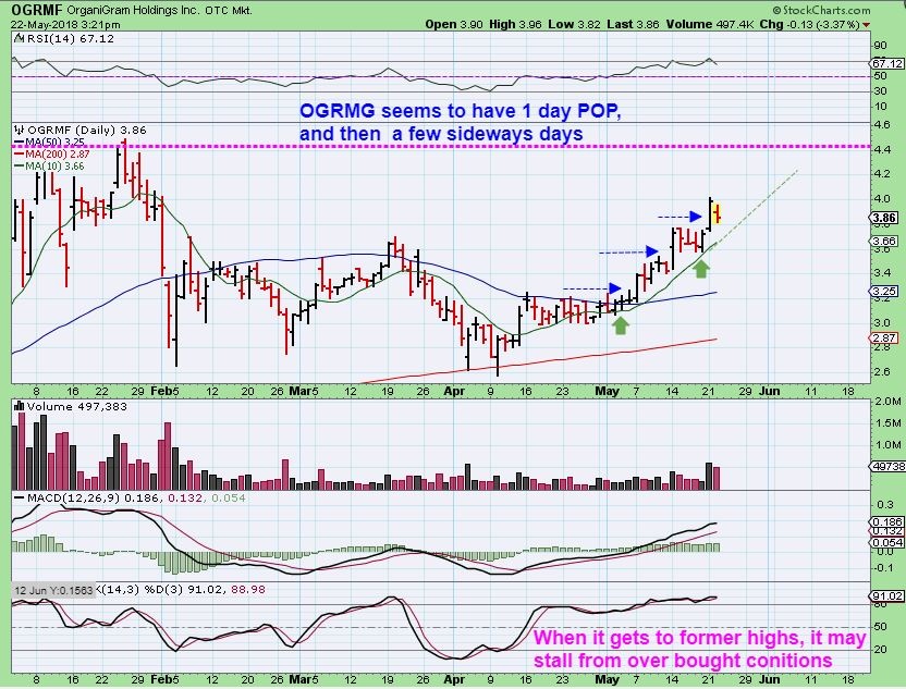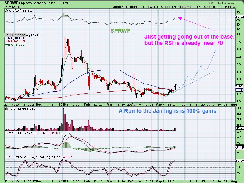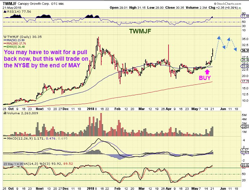 TWMJF – On may 14 at $25, it Popped higher on strong volume. I mentioned that they are going to be listed on the NYSE as CGC by the end of May. That should add buyers over time.
