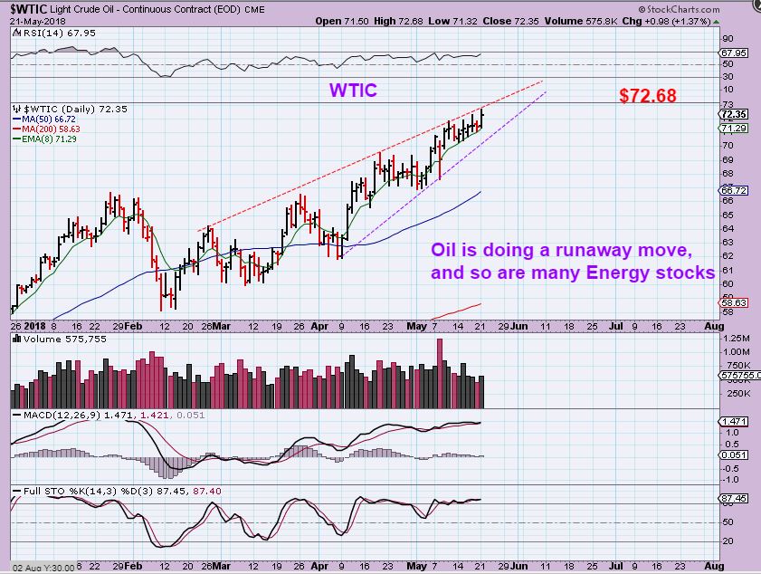 WTIC – Oil is in a runaway type move. It is climbing along the upper trend line. $72 & $74 targets have been a possibility.