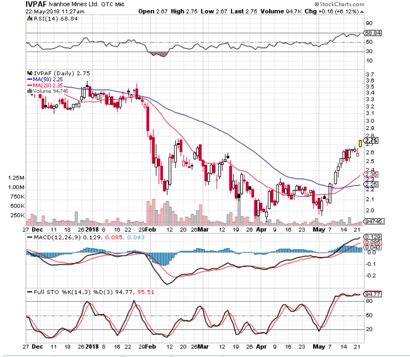Another miner that is moving this morning is Ivanhoe Mining (IVPAF). It will be interesting to see if volume and price are strong at the close. A pullback to the recent consolidation could be a place to add.