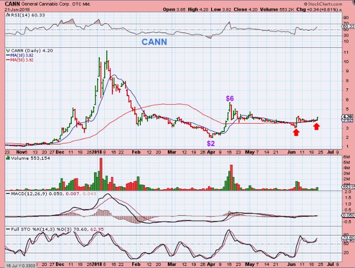 CANN – This pop looks like no big deal, but look at Aprils run.  It went $2 to $6 in 2 weeks, and that is 200% gains. It then consolidated along the 50sma and the next run could be as good as the first.   The sector is bullish.