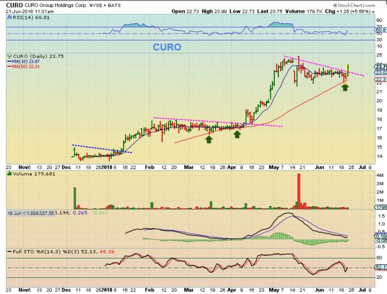 CURO  –  This broke out too, but dropped toward the end of the day  ( I captured this at 11:30 a.m.).  This is on my watch list, I traded it in April with SQ, MU, SGH, etc, etc.  It remains very healthy.  I’d keep it on a  watch list, since it is acting very well as the markets dropped.