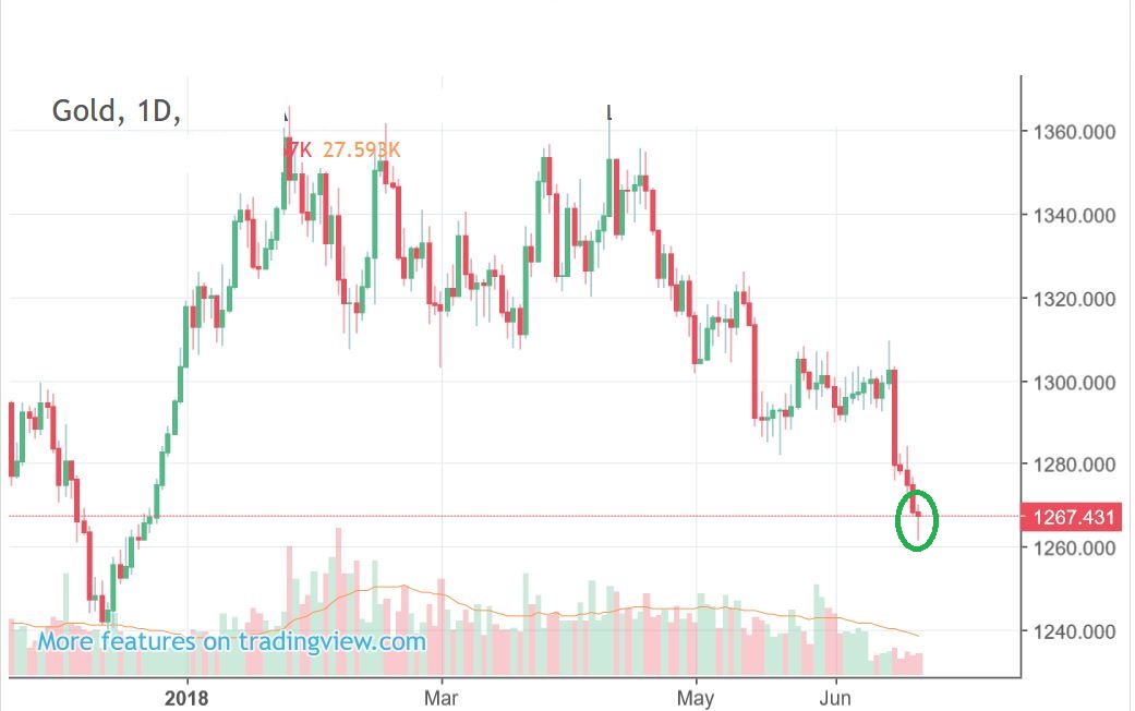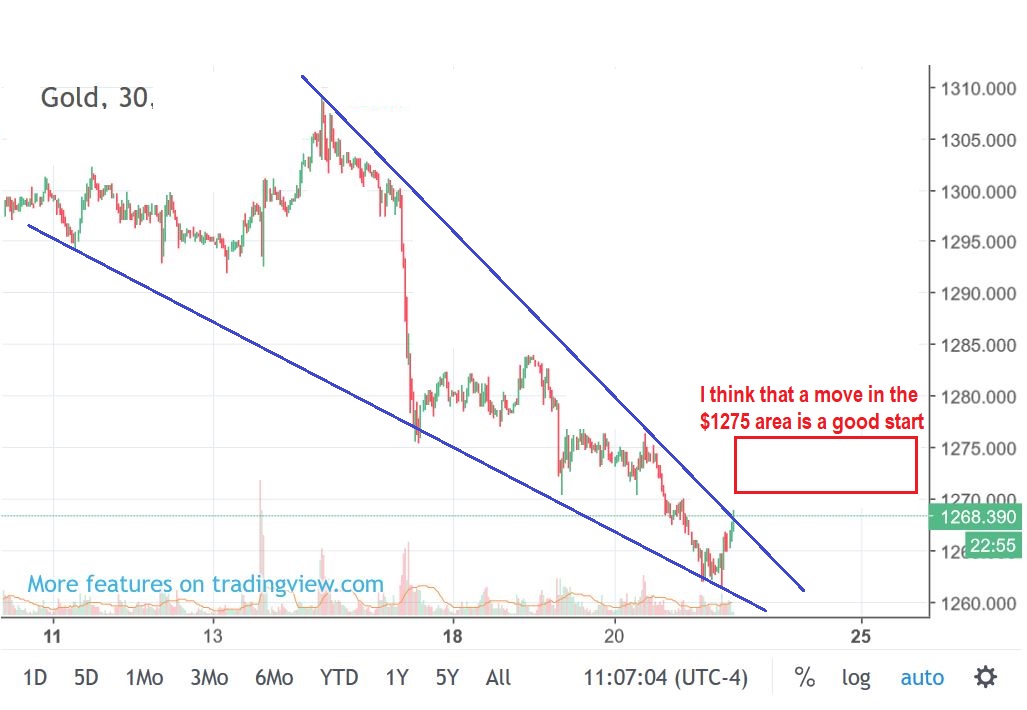 And that run to the top of the wedge in the above chart at $1268 now gives us this reversal candle.  We are watching $1272.40 for a swing low.  I would expect a move higher from this reversal candle,  thus we would also get a break above that wedge.