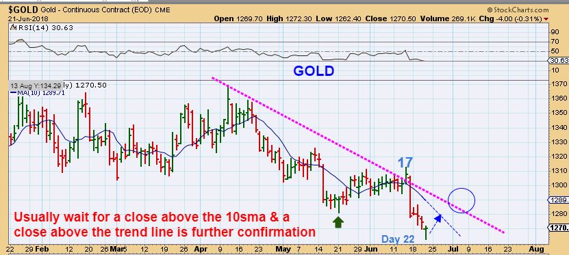 GOLD #2–  It could be the low, we are at day 22 and that is acceptable, so a break & close above the 10sma is usually a safe buy ( And a stop can be placed below the reversal).