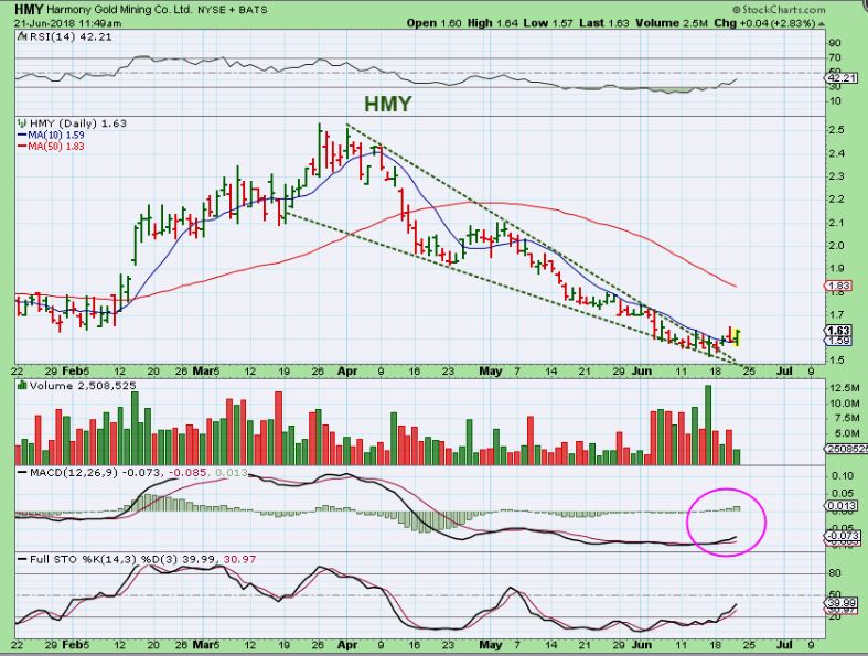 HMY – I used this chart on the same day, a wedge pattern with Capitulation and possibly forming its lows.