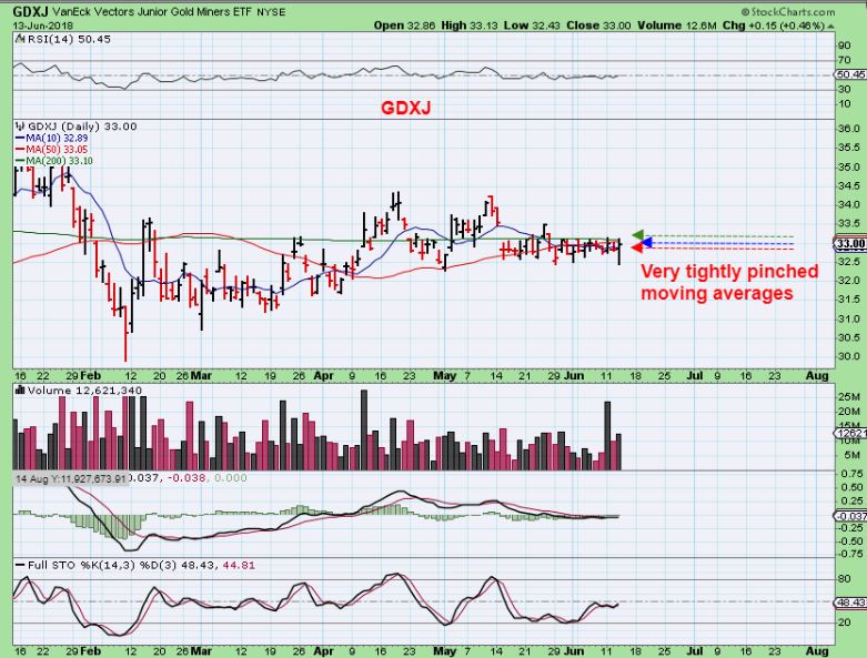 GDXJ WEEKLY – The volume is swelling as it pushes on overhead resistance. A break from this multi week tight consolidation pattern should lead to a nice strong run higher.
