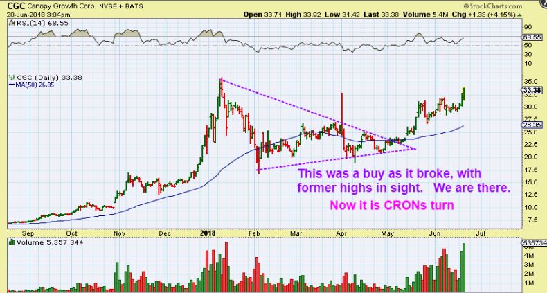 CGC –  So here it is now nearing that $35.  Stare at this chart pattern, and …