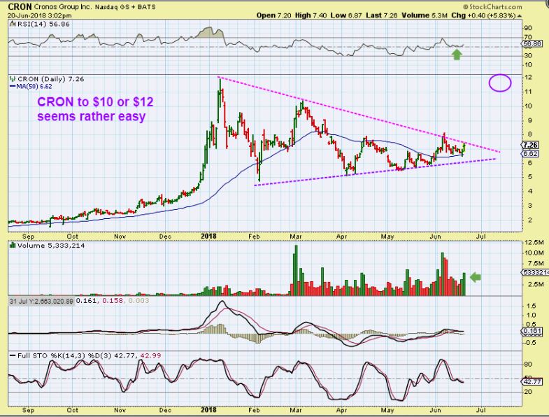 CRON – You’ll see it in CRON.  These 2 stocks now trade on the Main exchanges, and I think that CRON will do as CGC has done, since this sector is turning bullish with recent legalization laws passing.