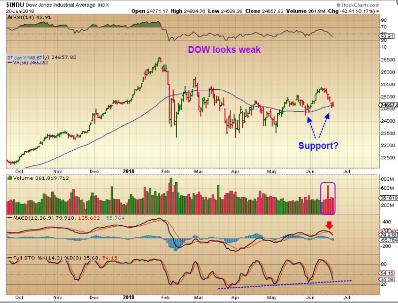 DJIA – The Dow dipped down to the 50sma, possible support, but it could drop further since it is not oversold yet and the MACD is weak.   TECH Looks very different…