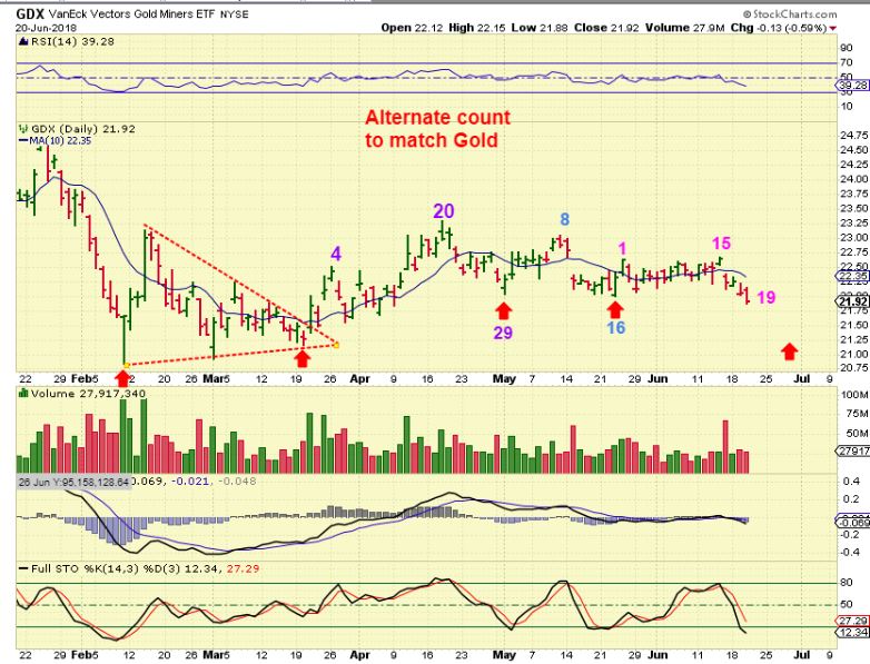 GDX Alternative Count – This count would match GOLD. It is acceptable because the 10sma did curl down into each dip, and back up on each rise.  A final daily cycle may also be shorter than a mid-point 33 day daily cycle, so it can bottom in this time period.