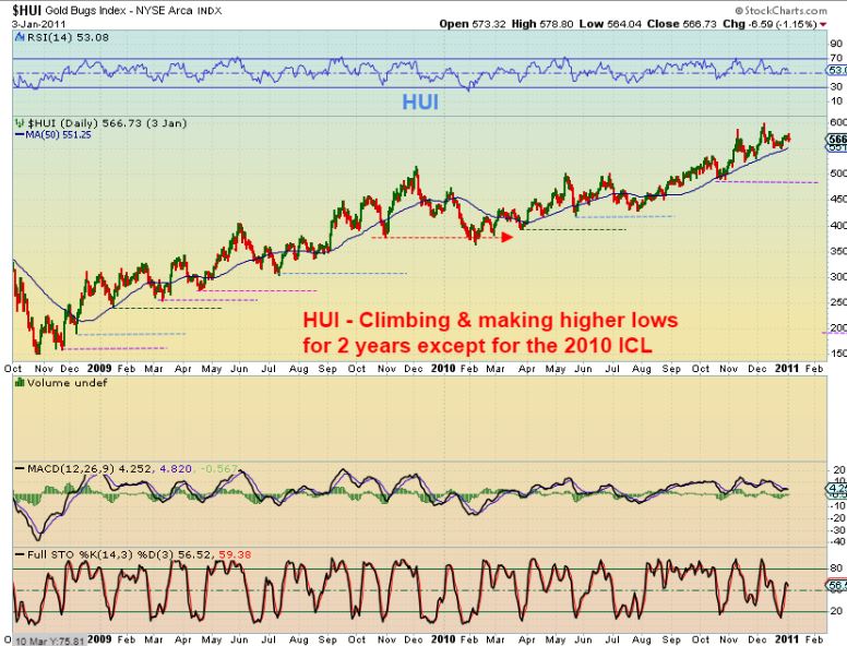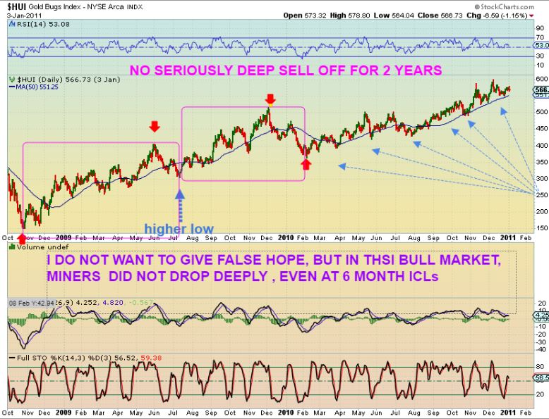 HUI 2008  – OUT OF THE OCT 2008 ICL – THE ONLY DEEP SELL OFF CAME AFTER A STRONG RALLY.  THE LOWS WERE FORMING AS HIGHER LOWS.  SEE THIS CHART & THE NEXT CHART TOO…