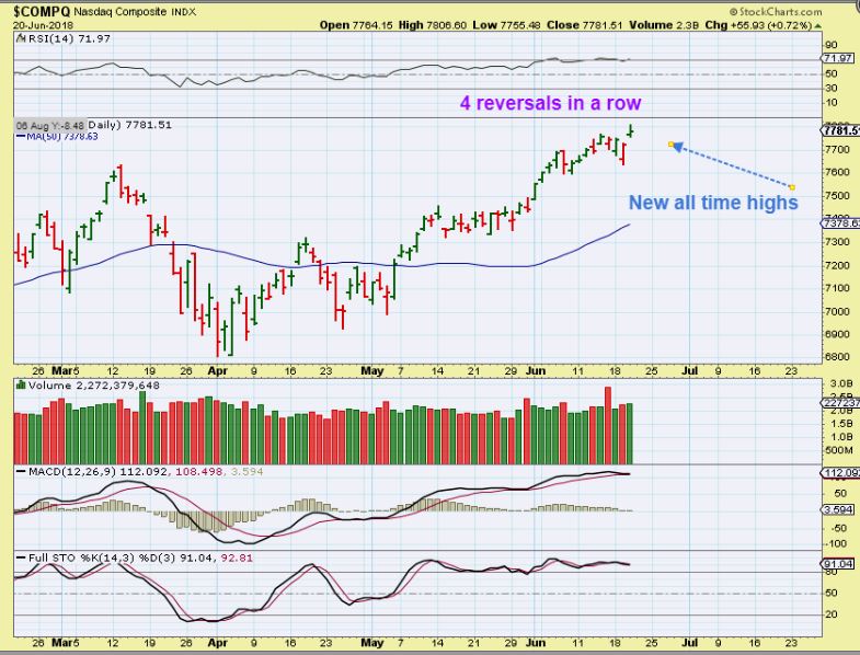 NASDAQ – Yesterday I mentioned that we were due for a dcl, but the NASDAQ dip keeps getting bought up. We had 4 reversals in a row, so it was strong.