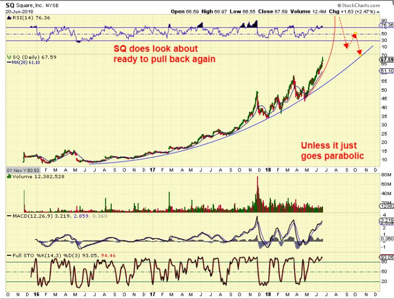 SQ –  Unless it goes parabolic.  We’ll know soon enough with that rising wedge in Nasdaq, but this is already extended, similar to November & April.  If it drops, we can buy the dip in a few weeks.
