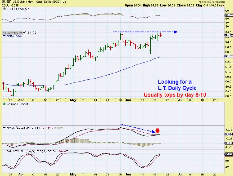 USD – Looks like a new high on day 4.  I am expecting it to top soon ( Read the chart). Slight MACD divergence is appearing.