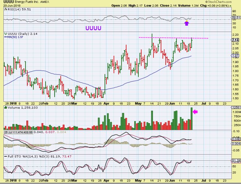 UUUU–  I have had this as a buy for a couple of weeks.  It does look ready to go with that volume surge yesterday.  Continue to hold or even buy if it breaks out