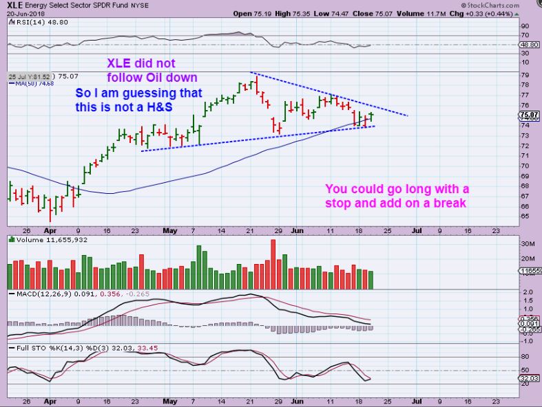 XLE – NO LOWER LOW like Oil. This could break higher with Oil at a dcl on day 49. I would use a stop under recent lows and raise it after the rise begins ( Gush, ERX, etc) .  Oil/Energy stocks may make another run.