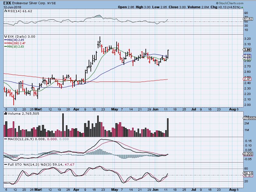 EXK TUESDAY – Yes,  EXK could fail & roll over if the FOMC MTG drops Precious metals, but that was a bullish set up and it did close at the highs of the days, higher than where I entered the trade.  I’ll use a stop, but it may only drop to the 200sma if it does drop.